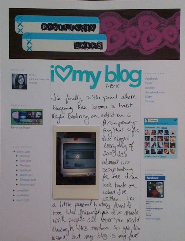 Next, we have Bekka and her FAVE BLOG...is her own blog too!!! I love love love love how she DID THIS!!! She made the background out of her BLOG design and then journaled in the middle!! GENIUS!!!! LOVEEEEEEEEEEEEEEEEEE it! :):):):):):):):):):):):):):):):):):):):):):):):):)